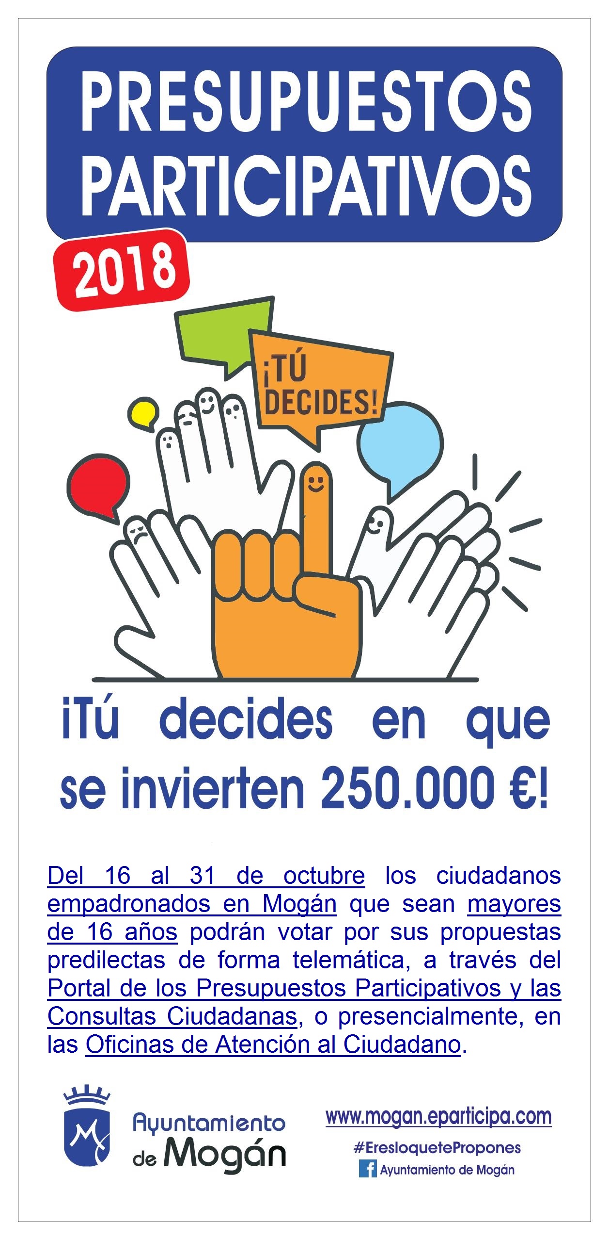 El próximo lunes 16 de octubre se abrirá el plazo para que los residentes empadronados en Mogán voten sus propuestas predilectas que se ejecutarán en 2018. De las 38 propuestas realizadas por los ciudadanos de Mogán, 4 podrán ser votadas tras superar las valoraciones técnicas, jurídicas y económicas.
