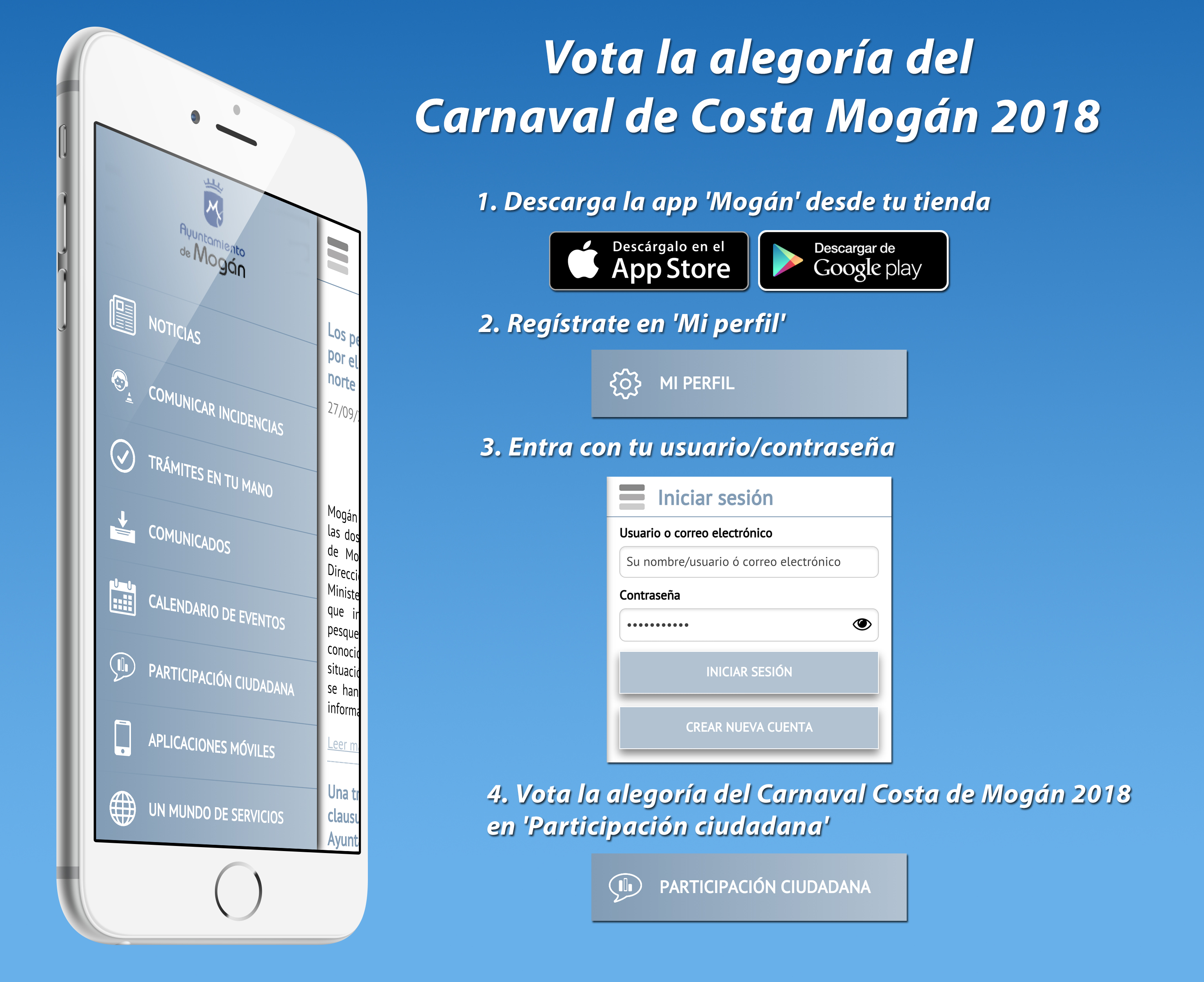 Para participar en la votación por la alegoría del Carnaval Costa Mogán 2018 a través de la aplicación para móviles de Mogán es necesario estar registrado creando una cuenta de usuario. La aplicación está disponible de forma gratuita y se puede encontrar buscando “Mogán” en Google Play Store (móviles Android) o en App Store (móviles iPhone).